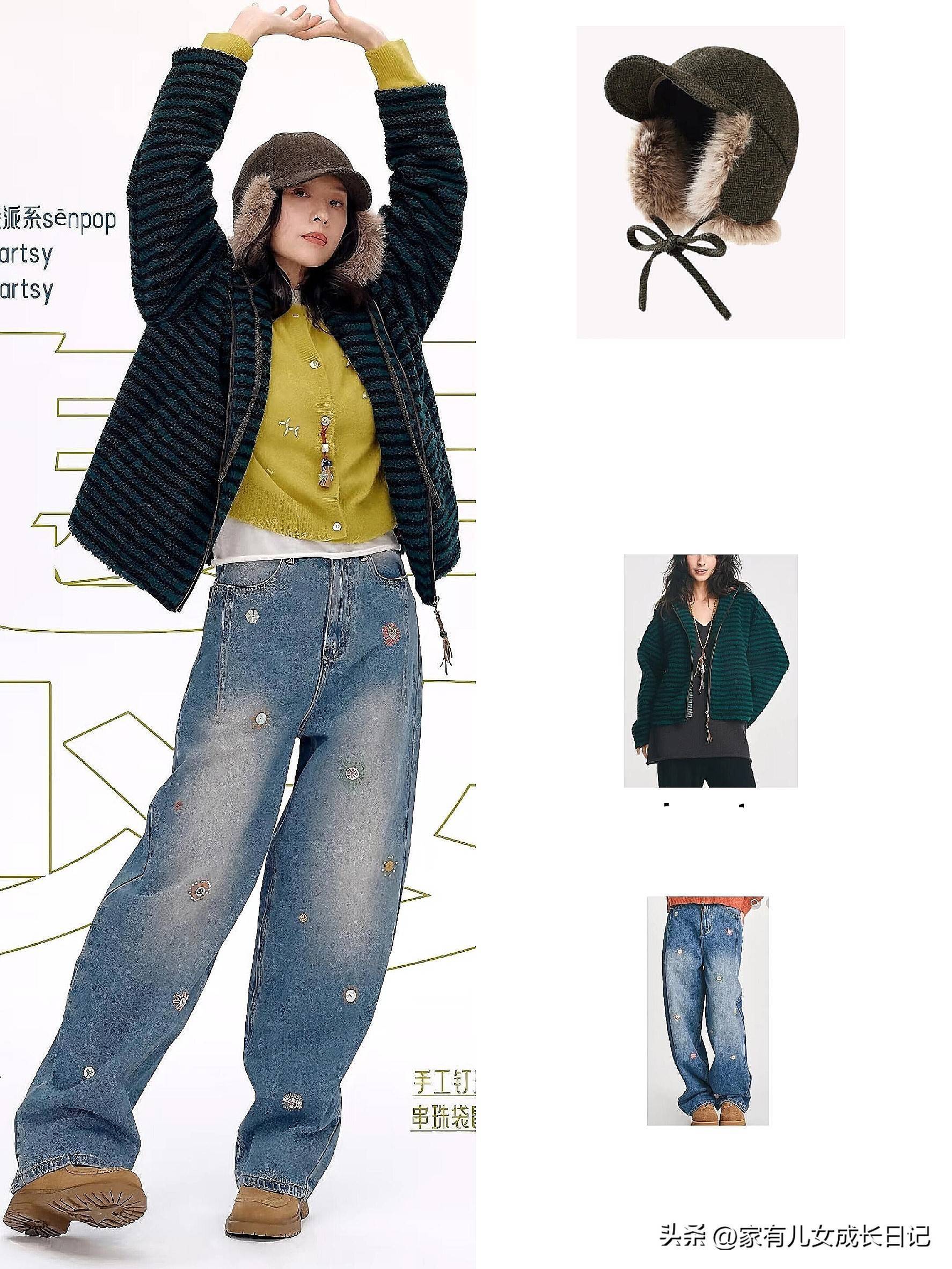 姜黄色针织开衫内搭白色打底,外搭蓝绿条纹外套,下身搭配带刺绣的牛仔裤,再配上一顶毛毛雷锋帽,色彩碰撞吸睛又显白。这种搭配把冬日的沉闷感瞬间打破,姜黄色特别衬肤色,黄皮姐妹也能轻松驾驭,日常出街赚足回头率。