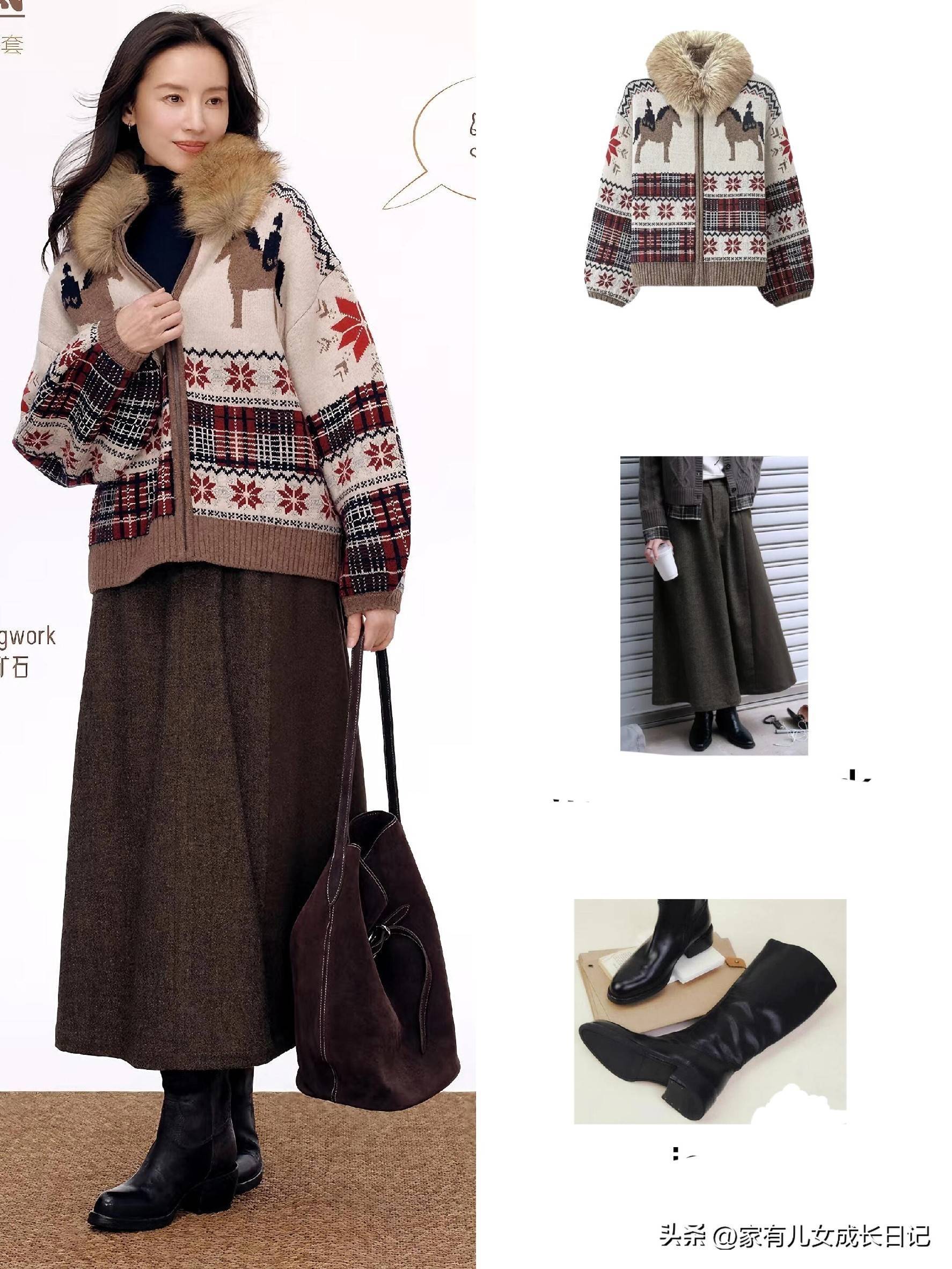 彩色提花毛衣叠穿格纹马甲,下身搭配咖色半裙,脚踩黑色短靴,复古又有层次感。提花毛衣的细节精致感拉满,格纹马甲增加穿搭层次,怕冷的话还能在裙内加条光腿神器,保暖和出片效果都不耽误。