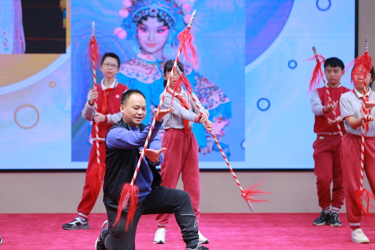除了表演形式的讲解,现场的同学们还体验了一场花枪功夫。“手腕要稳,眼神要跟着枪尖走!”广州粤剧院青年导演陈祥彪与肖婉婷邀请了9位“小勇士”上台,手把手教学粤剧武生的“功夫”。从持枪站姿的基本功,到简单的舞花枪技巧,老师们手把手地教,同学们一丝不苟地学。虽然动作略显稚气,但孩子们挺直的腰板、专注的眼神,赢得了老师“精气神十足”的夸奖。台上台下一片掌声,传统技艺的种子,在一次次模仿与练习中悄然播下。