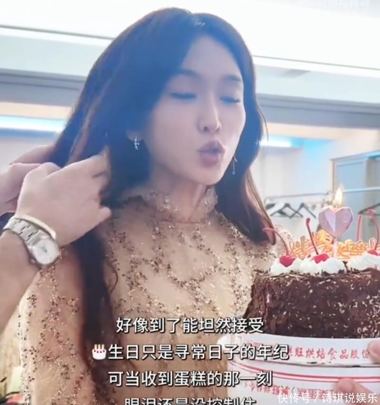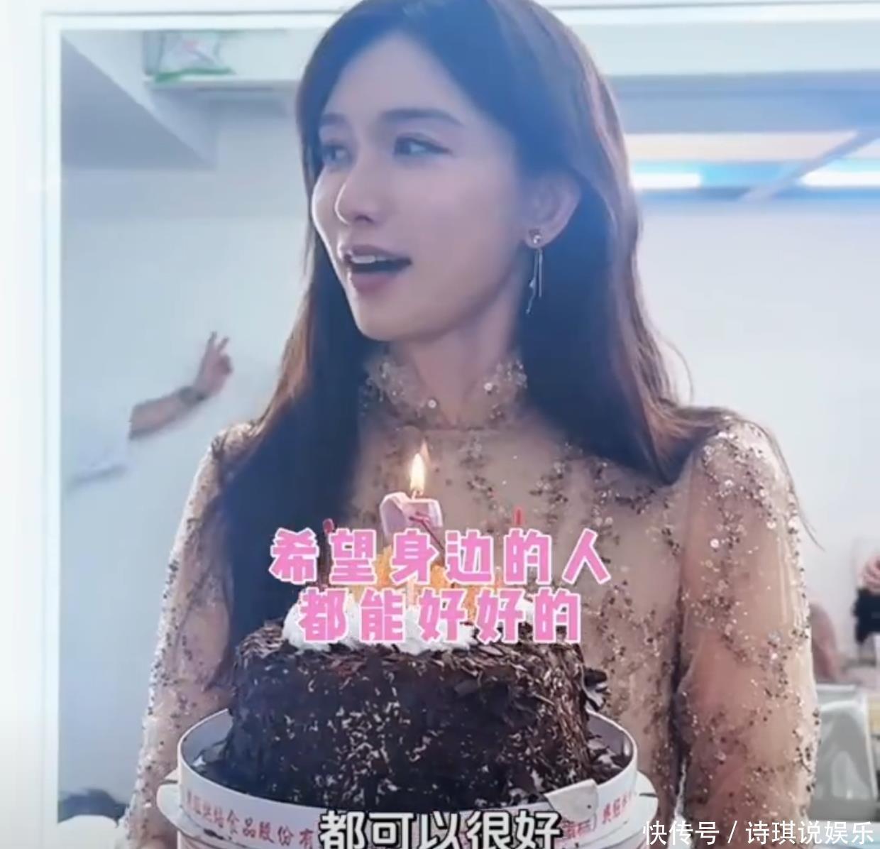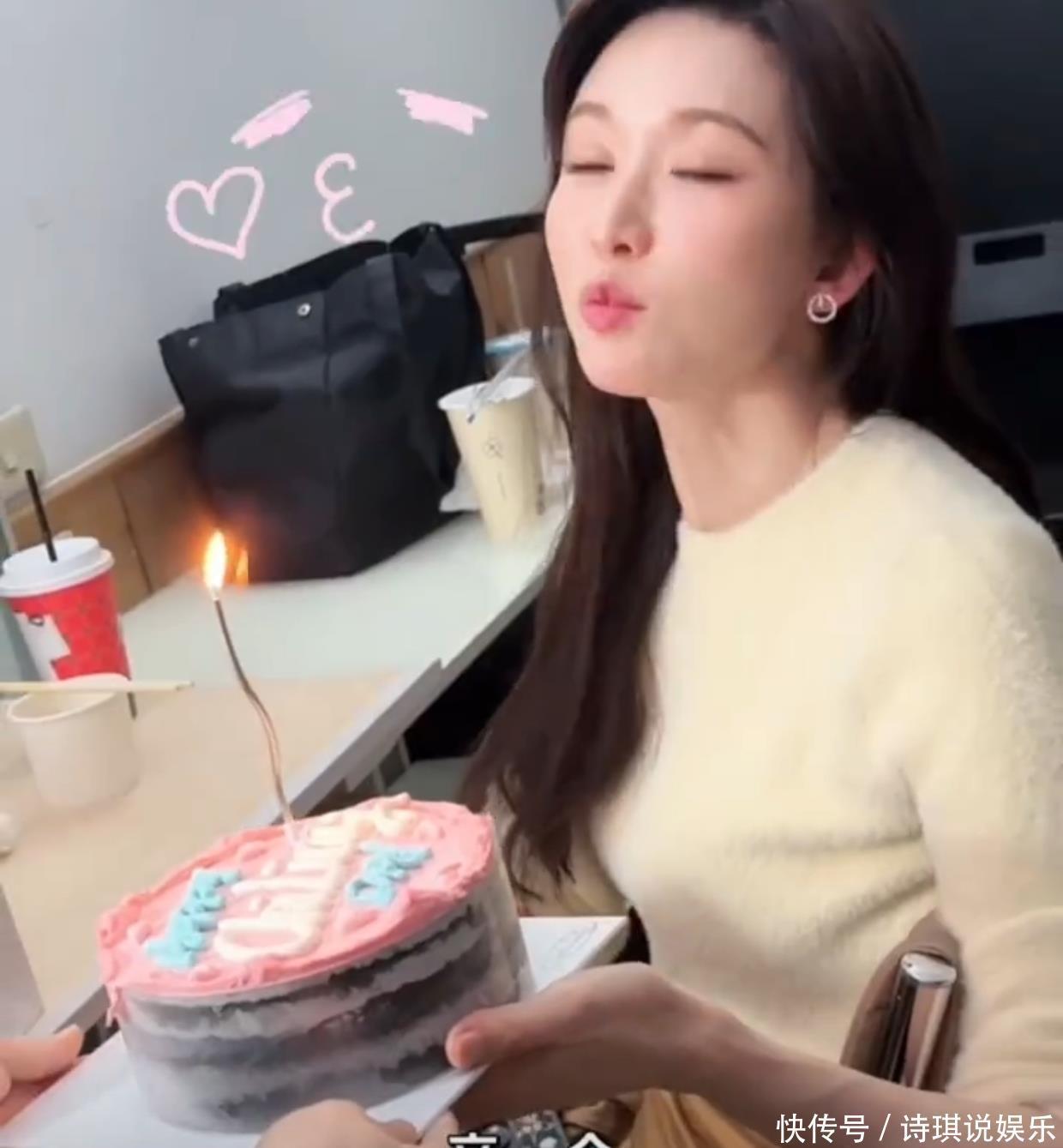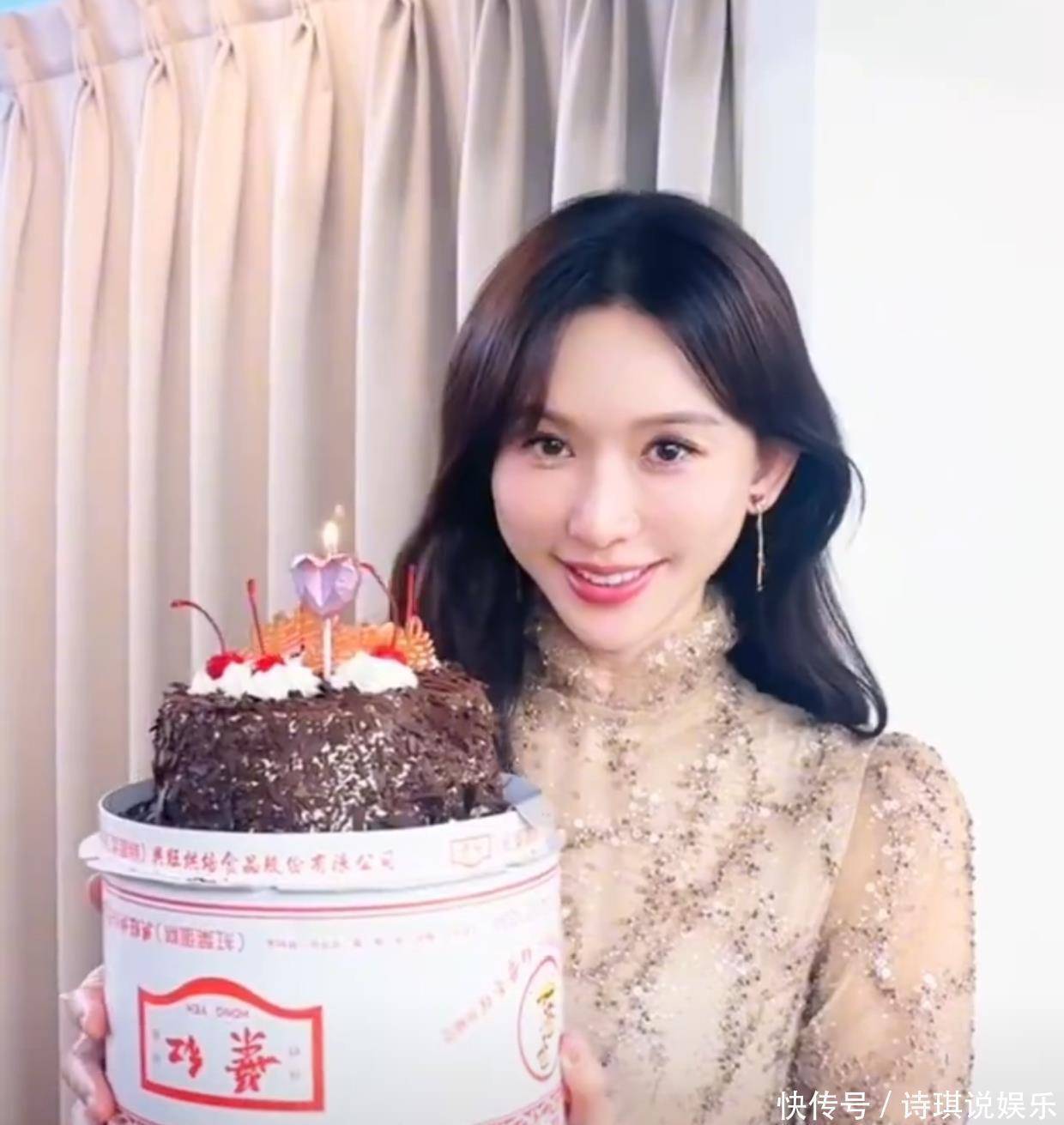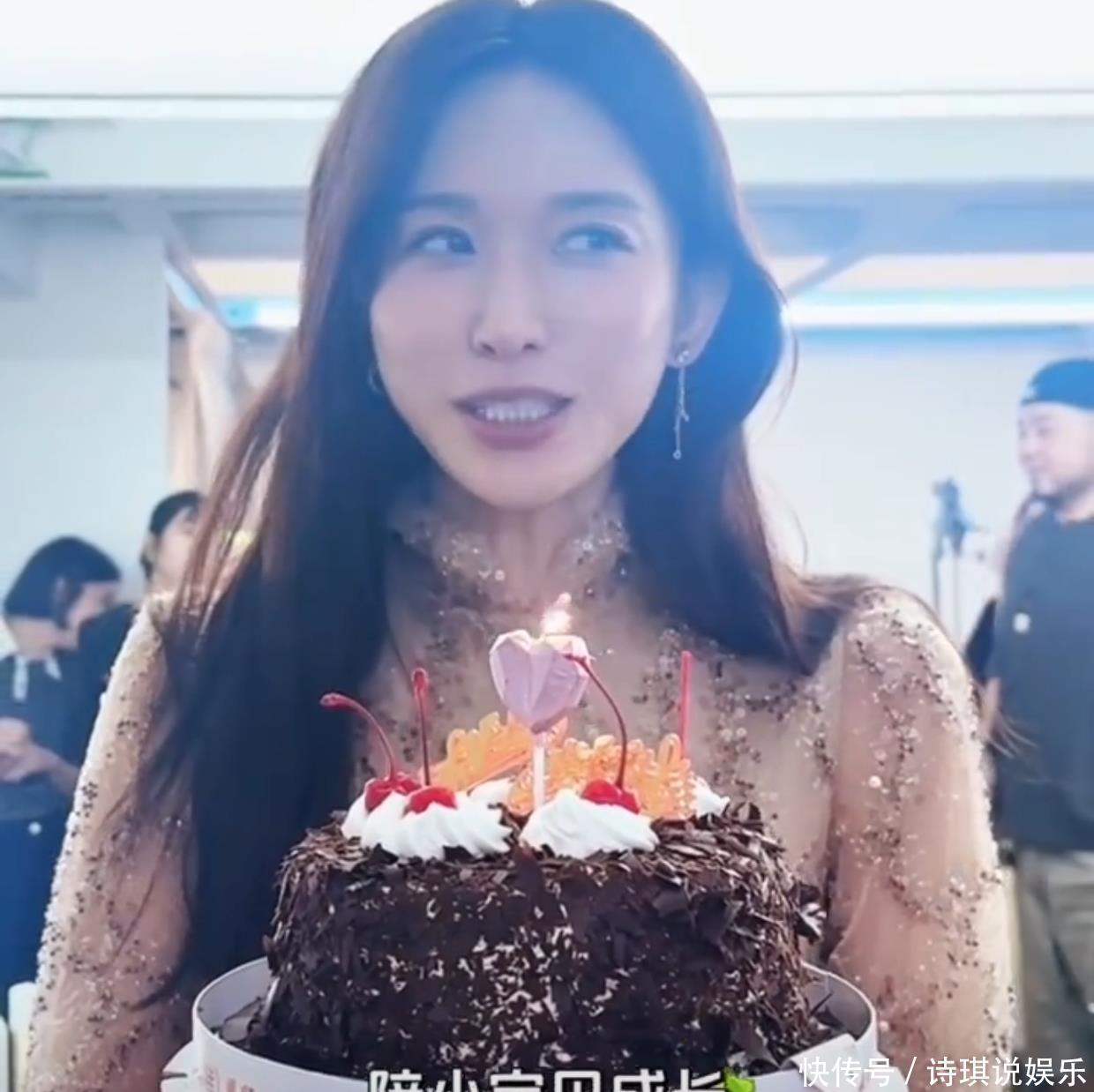 这时候工作人员捧了一个6寸的巧克力蛋糕过来,祝她生日快乐,蛋糕上还插了一个粉色爱心蜡烛,很符合林志玲的喜好。
