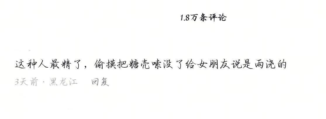 总说莫欺少年穷,也总说男人成熟较慢,但有些男性的行为及发言给人的感觉,何止是成熟较慢,而是可以上脱口秀、奇葩言论大赏的程度。这不,喜欢上网冲浪的博主,就刷到这一条视频,评论区有这么一句话--“当你冒着大雨去给她送糖葫芦的时候,已经证明了你是个深情男孩”。