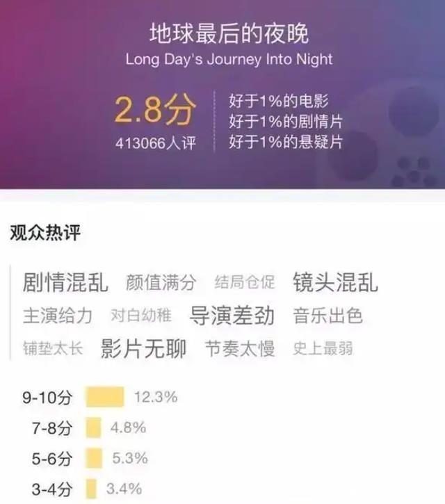 小情侣们一看这么浪漫,再加上看完电影肯定过夜了,这哪忍得住? 于是一窝蜂订票,导致上映前就破亿,首映日就有2亿票房。 结果等人们去看的时候才发现—— 这丫竟然是一部文艺片?! 晦涩、缓慢、云山雾绕,一个吃苹果的镜头竟然拍了5分钟。
