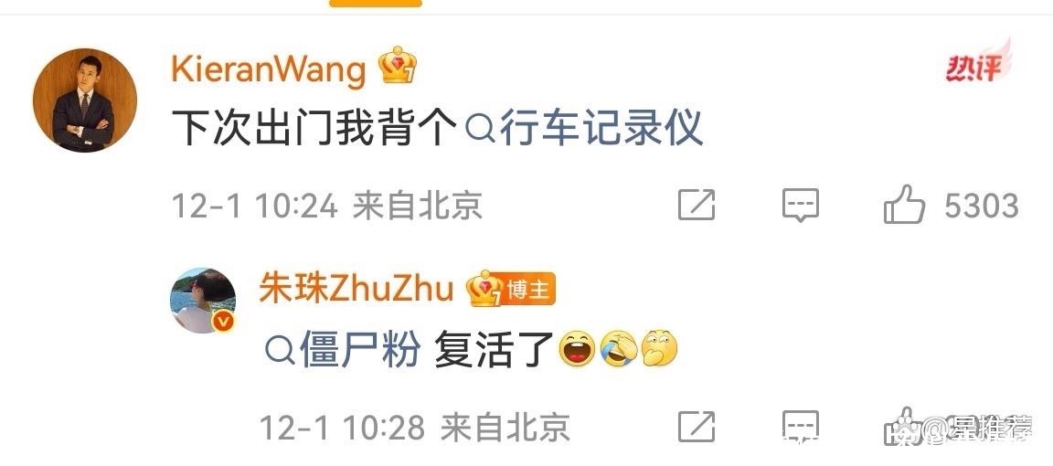 王昀佳也在评论区幽默回应:“下次出门得背上行车记录仪自证清白。” 朱珠随即打趣称其为“僵尸粉”,互动温馨有趣。