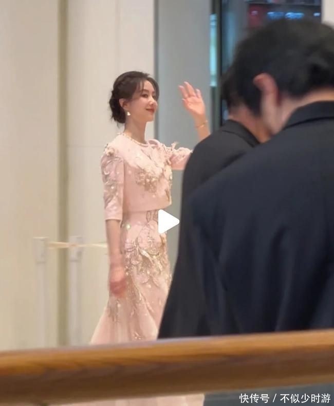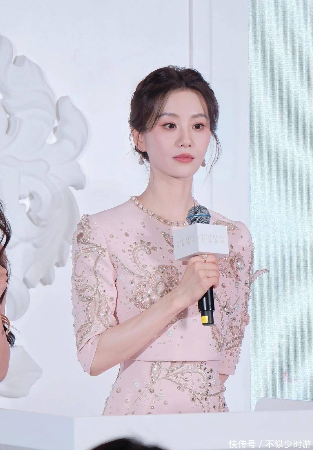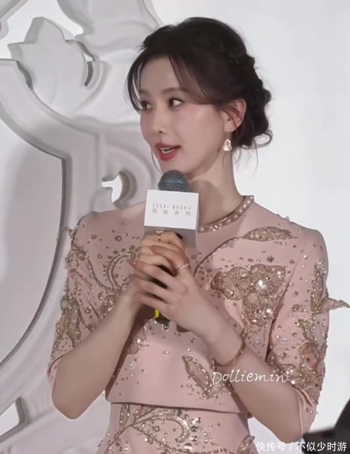 25. 她身穿一袭粉色刺绣长裙,裙身点缀钻饰,在灯光映衬下更显颈部修长优雅。