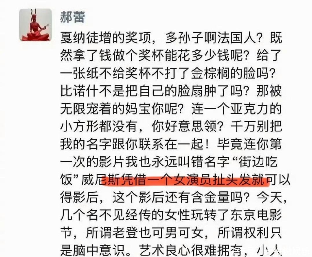 。当天,一张署名为演员郝蕾的朋友圈截图在网络上疯传。截图中有一段话格外刺眼:“威尼斯凭借一个女演员扯头发就可以得影后,这个影后还有含金量吗?”这段话发布的时间点,以及“威尼斯影后”、“扯头发”这两个关键词,让所有人的目光瞬间锁定在了女演员辛芷蕾身上——就在不久前,她刚刚凭借电影《日掛中天》中的表演,斩获了第82届威尼斯电影节最佳女演员的桂冠。而在电影里,她饰演的角色恰好有一段极具张力的“扯头发”情节。